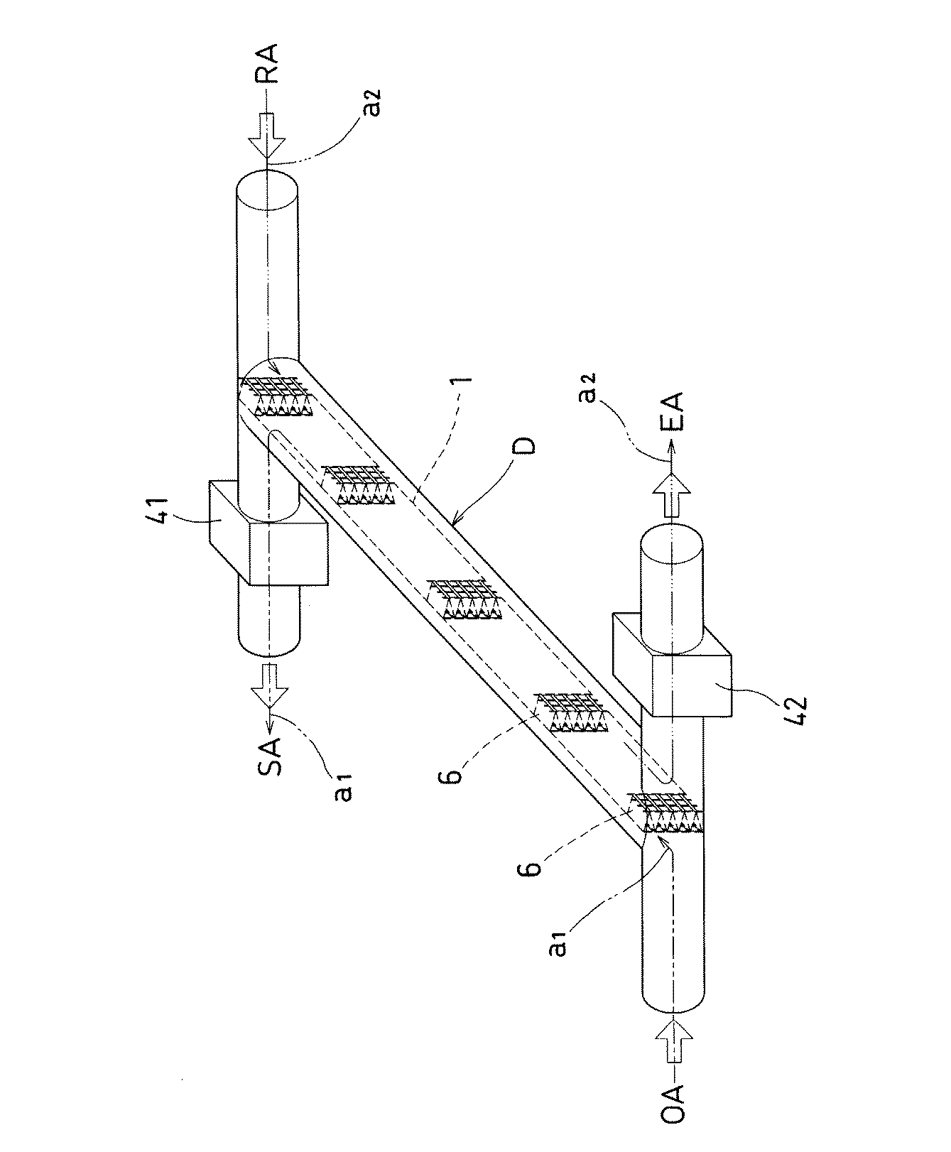 ダクト形状Dの両端はT字管によって二又となり、それぞれが外気(OA)ダクト、排気(EA)ダクト、還気(RA)ダクト、給気(SA)ダクトへ接続される。このうち給気(SA)ダクトには、第一空気たる室外空気を運搬する第一送風機を介設し、排気(EA)ダクトには、第二空気たる室内空気を運搬する第二送風機を介設してなる。すなわち、実施例3の全熱交換器は、熱交換機能を果たす熱交換素子部が独立形状であり、送風機と分離してなる。