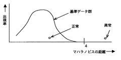 このような演算処理の後で、特徴を示す状態量であるマハラノビスの距離を下記の(5)式に基づいて求める。なお、(5)式においてjは1〜nまでの何れかの値をとり、n個の各測定値に対応するものである。また、kは項目数(パラメータの数)であり、ここではmとする。また、a11〜akkは上記の(4)式の相関行列の逆行列の係数であり、マハラノビスの距離は基準データすなわち正常運転状態のときは約1となり4以下に収まるが、異常になると数値が大きくなり、異常の度合い(正常からの離れ度合い)に応じて距離が大きくなるという性質を有する。なおここではクラスター分析に必要な非類似度、すなわち距離としてマハラノビスの距離を使用したが、標準化ユークリッド距離やミンコフスキー距離などや他の最短距離法や最長距離法を使うなどの多変量解析手法でも良い。