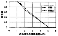図4は、トウネズミモチの葉一枚当りの透過損失と、葉を摘み取ってからそのままの状態で乾燥させた日数との関係を示す実験データである。トウネズミモチの2枚の葉について実験を行い、その結果を試料1と試料2で示した。さらに図4のトウネズミモチの葉一枚当りの透過損失の実験結果に、図3に示すトウネズミモチの1日目と5日目の透過損失の標準偏差値を□印で併せて示した。透過損失の標準偏差値σは図3に示す葉の枚数に対する透過損失の測定値から次式により得られる。すなわち、葉の枚数nに対する透過損失の測定値をLn、測定時の葉の枚数の最大値をMとすると、