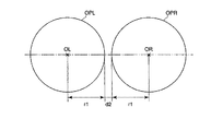 また、図2に示すように左右のプロジェクター43L、43Rは、それぞれの射出光軸PLおよびPRが表示パネル4上の中心軸O3と交わる点S上で一致するように、所定の角度αを有して取り付け配置される。これにより、プロジェクター43L、43Rから光軸PL,PRで表示パネル4に観察像が投影されると、左右の観察像が一致して表示パネル4上に投影される。また、図示しない左プロジェクター43Lが内蔵する投影光学系の射出瞳と、同じく図示しない右プロジェクター43Rが内蔵する投影光学系の射出瞳は表示パネル4のフレネル凹面鏡のレンズ作用と、拡散板の光拡散作用により、図5に示すように表示パネル4上のS点から所定の距離LS1の位置P1近傍に拡大された状態で投影され、前記左右の投影光学系の射出瞳は図6のOPL、OPRのごとく左右に分離された状態でそれぞれ所定の深度d1で形成される。左右の瞳OPL、OPRは、深度d1が30mm程度、中心点OL、ORからの半径r1が30mm程度、左右の瞳OPL、OPR間の距離d2が5mm程度にそれぞれ設定されている。これにより瞳OPL、OPR内に観察者(術者)Dの左右の眼EL、ERを一致させることにより、表示パネル4を見ている観察者(術者)Dの左眼ELには、入射光軸WLで観察像が導かれ、右眼ERには入射光軸WRで観察像が導かれる。その結果、プロジェクター43L、43Rから表示パネル4に投影される観察像が観察者Dによって3D(立体)観察される。