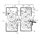 73は第一の定着器H1における定着ローラー71の清掃手段であるクリーニング装置である。74は第二の定着器H2における定着ローラー71の清掃手段であるクリーニング装置である。本実施例においては該クリーニング装置73・74を、第一及び第二の両定着器H1・H2において違えたものにしている。すなわち、第一の定着器H1におけるクリーニング装置73はウエブ方式(ウエブシステム)のクリーニング装置にしてある。第二の両定着器H2におけるクリーニング装置73はパッド方式のクリーニング装置にしてある。このウエブ方式のクリーニング装置73とパッド方式のクリーニング装置74については後述する。