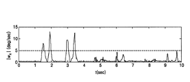(2)動き基盤の音声発生装置の左右方向の動きを認識する場合、|ωz(kz−1)|≦Czから|ωz(kz)|>Czに変わる時点kzを探知する。音声発生装置の左右方向の動きは、音声発生装置の本体座標系のz軸上に配置されている角速度センサーを使用して認識される。