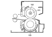 図8に、このような画像形成装置の概略構成を示す。薄肉の金属製のヒートローラ101の内側に、ハロゲンランプ102が配置されている。ヒートローラ101に被定着材を十分に加圧、接触させるために、プレスローラ103はその表面に弾性部材が配されている。そして、ヒートローラ101とプレスローラ103とは、図示されていない加圧機構によって所定の圧力を印加された状態で支持されている。さらに、図示されていない駆動源によって、被定着材の搬送速度と同一となるように、ヒートローラ101及びプレスローラ103がそれぞれ矢印の方向に回転する。