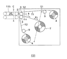 収納カセット151は、テープT1およびT2と、巻取りローラ4と、収納ドラム7と、出入口ローラ3と、アイドラ9と、センサS1、S2とを含む。収納カセット151の筐体には、紙幣出入口2が設けられている。紙幣を収納カセット151に収納するとき、下部搬送路116によって搬送された紙幣は、紙幣出入口2から挿入される。2つの巻取りローラ4にはそれぞれ所定長のテープT1およびT2が予め巻かれている。これらの巻取りローラ4は、テープT1およびT2を送り出し、これにより、テープT1およびT2を矢印Aの方向へ移動させる。テープT1およびT2は、アイドラ9およびローラ3を介して、紙幣出入口2から挿入された紙幣を挟み込む。収納ドラム7は、巻取りローラ4がテープT1およびT2を送り出すと同時に、テープT1とT2との間に紙幣を挟んだ状態でテープT1、T2および紙幣を巻き取る。