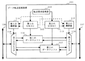 従来のDMA転送方式によるデータ転送処理装置の構成例を、図12に示す。図12において、従来のデータ転送処理装置101は、転送要求処理部110と、第1のダイレクト・メモリ・アクセス・コントローラ(DMAC)112と、第2のDMAC113と、第1の調停器114と、第2の調停器115と、第1のデータバッファ116と、第2のデータバッファ117と、第1のセレクタ118と、第2のセレクタ119とを備える。データ転送処理装置101は、第1のシステムバス106及び第2のシステムバス107に接続され、双方のシステムバス間に発生するデータ転送処理を実行する。