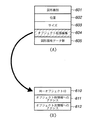 次に、図6(B)は、オブジェクト拡張編集604の詳細を示し、ここでは自由線描画において、同一ペン属性で描画する場合に、同一オブジェクトとして編集するための情報である、同一オブジェクトIDが格納されている。これは、一連のマウス操作で描画された寸断された自由線オブジェクトが、図形データとしては別個に格納されるが、編集上では同一オブジェクトとして扱うためのIDである。続いて611には、前記同一オブジェクトとして扱うためのリンクされたオブジェクト情報の前のオブジェクトへの道しるべとなるアドレスが格納されている。また612では、前記611と同様に後ろのオブジェクトへのアドレスが格納されている。