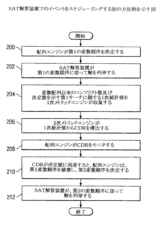 図3は、SAT解答装置14におけるイベントをスケジューリングする別の方法を示す。ステップ200では、SAT問題に対する有効な解を探索する間に、配列エンジン24は、そのSAT問題に対する解を列挙する第1の変数順序を決定する。ステップ202では、SAT解答装置14は、第1の変数順序に従って、SAT問題に対する解を列挙し、その解が有効であるか否かを判定する。ステップ204では、SAT解答装置14がSAT問題に対する解を列挙し、その解が有効であるか否かを判定する場合に、1次メトリックエンジン18が、その変数順序以来のコンフリクト数及び決定数を示すそのサーチにおける1次統計値を収集する。ステップ206では、2次メトリックエンジン20がこれらの1次統計値からCDRを導出する。ステップ208では、配列エンジン24はそのCDRをモニタする。ステップ210では、そのCDRが所定値に達すると、配列エンジンは第1の変数順序を破棄し、SAT問題に対する解を列挙する第2の変数順序を決定する。所定値は予め定められた値でもよいし、SAT問題に対する有効な解の探索における非能率性に関する許容できないレベルに関連してもよい。ステップ212では、SAT解答装置14はその第2の変数順序に従って解を列挙し、その時点で本方法は終了する。図3に示される方法は、SAT解答装置14がSAT問題に対する有効な解を選択する場合に反復されてもよい。図3に示される方法では特定のステップが特定の順序で生じるように図示及び説明されているが、本発明は、図3に示される方法の適切などのステップも適切ないかなる順序で生じてもよいことを想定している。
