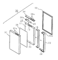 図15に従来の電池パックの一般的な構成例の模式的分解斜視図を示す。電池パックは、直方体状の電池ケース11をそれよりも一回り大きい合成樹脂製の直方体状の外装ケース30に収容したものである。なお、外装ケース30は共に一側面が開放された直方体状の第1外装ケース半体31と第2外装ケース半体32とで構成されている。両外装ケース半体32及び32は開放された一側面の外形寸法が同一に形成されており、開放された一側面同士を対向させて合体させた状態でその内部に電池ケース11及びその他の回路等を収容可能な空洞が形成されるようになっている。