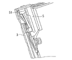さらにカードをコネクタ1に挿入してゆくと、スライダ5の斜面57がカードの傾斜部13と当接し(図9参照)、コイルスプリング7を押し縮めながらスライダ部5が挿入方向に移動してゆく。このとき、ガイドピン51の先端部53がレール溝33のスロープ33bを登ってゆく状態を示したのが図9である。