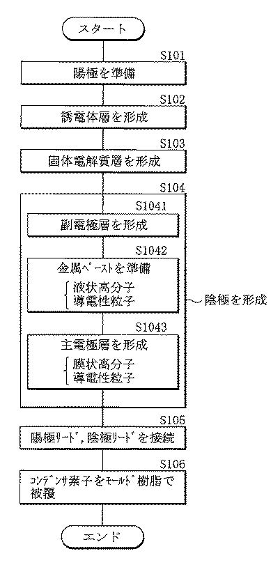 【解決手段】 固体電解質13上にPTC機能を有する2層構造の陰極14(副電極層14A,主電極層14B)を形成する際に、固体電解質層13の表面にカーボンペーストを供給して膜化することにより副電極層14Aを形成したのち、その副電極層14Aの表面に金属ペースト(液状高分子,導電性粒子)を供給して膜化することにより主電極層14B(膜状高分子,導電性粒子)を形成する。電解コンデンサの製造途中において誘電体層12に過度な外力が加わらないため、その誘電体層12が製造途中において力学的要因に起因して破損しにくくなる。