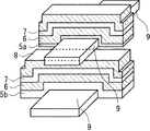 そしてそれらの素子は異なる面に形成されている。なお、この図においては配線金属、制御ゲート電極8ないしソース・ドレイン領域9に対して配線金属を結合させる為のコンタクト領域、層間絶縁膜、等は省略してある。この様にすると全ての素子を単一の面内に形成した場合と比較して不揮発性半導体記憶装置の面積を縮小する事が可能となり、集積度の向上が図られると言う利点がある。図19においてはメサ分離SOI型素子を用いた場合の例を示したが、メサ分離SOI型素子に限らず、通常の平面構造素子、トライゲート素子、パイゲート素子、オメガゲート素子、ゲート‐オール‐アラウンド素子、縦型構造素子、フィン型構造素子(FINFET)等の素子を用いた場合にも同様の利点が得られる。なお、図19においては幅ないしトンネルゲート絶縁膜厚の値の小さい素子がより上の面に形成されている場合を示しているが、この事は本質的ではなく、素子の形成される面の上下関係はどの様であっても同様の効果が得られる。