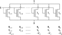 この場合にはSを接地してDにプラスの電圧を印加した状態でGにVTH,HとVTH,Lとの間の電圧を印加することによってSとDとの間を流れる電流はan-1an-2・・・a1a0に依り2進法表示された値に比例する。 In this case, by applying a voltage between V TH, H and V TH, L to G with S grounded and a positive voltage applied to D, the current flowing between S and D is a n-1 a n-2 ... proportional to the value displayed in binary notation depending on a 1 a 0 .