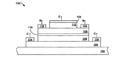 厚さ約30nmの砒化アンチモン化ガリウム(GaAsSb)の層が、トンネリング抑制層110の上に成長させられて、ベース108を形成する。厚さ約100nmのインジウム燐の層が、ベース108の上に形成されて、エミッタ112を形成する。エミッタは、砒化アルミニウム・インジウム(AlInAs)、砒化アルミニウム・ガリウム・インジウム(AlGaInAs)、砒化燐化アルミニウム・インジウム(AlInAsP)、または、アルミニウム、ガリウム、インジウム、窒素、燐、砒素、及び、アンチモンのうち2つ以上の元素を含む別の組成といった、他の材料から形成することも可能である。次に、コレクタ接点114及び116、ベース接点118及び122、及び、エミッタ接点124が、それぞれ、サブコレクタ104、ベース108、及び、エミッタ112のそれぞれに達するエッチングの後、それらそれぞれの層の上に形成される。