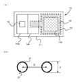 次に、本実施例1による無線モジュール10の適用例について図面を用いて説明する。図3は、本実施例1による無線モジュール10の構成を示す平面図及び断面図である。本実施例1による無線モジュール10は、周囲を囲む周囲導体11a及びその内部を充填する誘電体11bとからなる基板12と、受信用平面アンテナ13bを内包する受信装置14bと、送信用平面アンテナ13aと、送信装置14aとを含む。周囲導体11aは、例えば銅合金等の導体であり、誘電体11bは、例えばポリテトラフルオロエチレンである。誘電体11bの一部には、壁部材17によって囲まれた導波路18が形成されている。壁部材17は、周囲導体11aと電気的に接続された導体であり、図3(a)に示すように連続的に形成される構造又は伝送する信号の波長よりも小さい間隔で導体を間欠的に配置する構造でも良い。導波路18は、壁部材17と周囲導体11aとによって囲まれた閉空間となっている。このような構造によって、この内部に入力された電波又は信号は、開放面以外の部分から外部には漏出しないように構成されている。