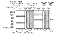 図9に第1のスロット構成例を示す。基地局から各端末への下り通信と、各端末から基地局への上り通信は時間的に多重され同一周波数帯を用いて行なわれる。また、ここでは、上りリンクのFHにおいてホッピングする周波数の最小単位は、下りリンクのOFDM信号におけるサブキャリアの周波数間隔ΔFと同じとする。