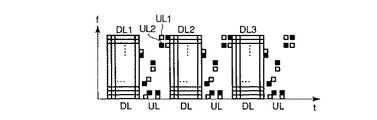 図16に第8のスロット構成例を示す。基地局から各端末への下り通信と、各端末から基地局への上り通信は時間的に多重され同一周波数帯を用いて行なわれる。また、ここでは、上りFHにおいてホッピングする周波数の最小単位は下りOFDMのサブキャリアの周波数間隔ΔFと同じとする。