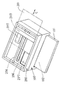 蓋部材223は、矢印B方向にばね付勢されており、通常状態では図1に示すような開口部221を覆う閉鎖位置に保持されている。前記開口部221を開く場合は、ユーザが装置前面から垂直蓋部223bを装置内部へ向けて矢印X方向へ押し込むことにより、蓋部材223が付勢ばね力に抗して回転中心222を中心に内方へ回転し、水平蓋部223bが矢印A方向へスライドする。そして、蓋部材223を矢印A方向へ十分に押し込むことにより、前記開口部221の垂直開口部221b及び水平開口部221aが同時に開口させられる(開放される)。そして、蓋部材223は、回転中心222周りのフリクションによって軽ロック状態となっているため、手を離して押し力を無くしても開放位置に静止状態で保持される。つまり、装置前面から垂直蓋部223bを押すだけで図1の閉鎖状態から図2及び図3の開放状態にすることができる。一方、前記開口部221を閉じる場合は、蓋部材223を図2及び図3の開放状態から軽く引き戻すだけで、蓋部材223を戻り方向へ回転させ、水平蓋部223bを矢印B方向へスライドさせることで図1の閉鎖状態に戻すことができる。