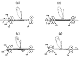 ガイドG1およびG2は、フィルムFを傷つけない素材および形状であれば、特に制限はないが、駆動ローラ(上記では43、52)同様表面を樹脂などの柔軟性のある素材で被覆したものが好ましい。