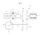 以下、本発明の実施の形態を図面に基づいて詳細に説明する。図1はハイブリッド車両の駆動装置10を示す概略図である。図1に示す駆動装置10は、前輪駆動用のハイブリッド車両に適用される駆動装置10であり、動力源として電動モータである駆動モータ11と内燃機関であるエンジン12とを有している。駆動モータ11はモータ側駆動歯車13aが固定されたモータ出力軸14を有しており、これに平行となる前輪駆動軸15にはモータ側駆動歯車13aに噛み合うモータ側従動歯車13bが固定されている。また、前輪駆動軸15の先端には終減速小歯車16が固定されており、この終減速小歯車16に噛み合う終減速大歯車17には図示しないディファレンシャル機構が組み付けられる。ディファレンシャル機構から車幅方向に伸びる車軸18は、駆動輪としての前輪に連結されており、駆動モータ11から前輪駆動軸15を介して伝達されるモータ動力は、ディファレンシャル機構を介して左右の前輪に伝達されることになる。
