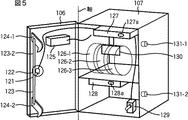 結果として、係止部124−1,124−2は、図6で示される実線の状態の場合、すなわち、係止部124−1a,124−2aの場合、係止部124−1a,124−2aの鍵状の凹部が筐体107の内部に設けられた凸部131−1,131−2に対して、それぞれ係止された状態となるので、扉106は、筐体107に対して開放不能な施錠された状態となる。一方、鍵が挿入されて、所定の方向に回転されると、対応して回転板122が図中左方向に回転し、支持棒123が上方向に移動させられることにより(支持棒123bの状態にされることにより)、係止部124−1,124−2の右端部が持ち上げられて、係止部124−1b,124−2bの状態となり、筐体107の内部に設けられた凸部131−1,131−2より係止されていた状態から開放されることになるので、扉106が筐体107から開放可能な状態、すなわち、開錠された状態となる。