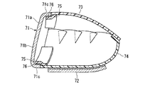 次いで、内圧成形工程において、この成形品前駆体3を内圧成形した。具体的には、図4に示すように、上型71aと下型71bとからなる金型71内に成形品前駆体3を配置し、油圧プレスで金型を閉じ、続いて、加圧バッグ70に空気を送って加圧バック70を膨張させた。そして、膨張した加圧バッグ70によって第1のプリフォーム61および第2のプリフォーム64を金型71に2気圧の圧力で押圧させつつ、金型71をマトリックス樹脂の硬化温度に応じた温度に加熱して各プリフォームのマトリックス樹脂を熱硬化させて成形した。この成形によって、第1のプリフォーム61がソールになり、第2のプリフォーム64がクラウンになり、補強用プリプレグ62aがソールの補強体になり、補強用プリプレグ62bがクラウンの補強体になり、接合用プリプレグ63aがソールとフェース板との接合体になり、接合用プリプレグ63bがクラウンとフェース板との接合体になった。