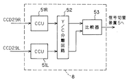 図1に示すように本発明の実施例1の立体内視鏡装置1は、立体撮像を行う立体内視鏡2と、立体内視鏡2に照明光を供給する光源装置3と、立体内視鏡2の撮像手段に対する信号処理を行う信号処理装置4と、信号切替を行う信号切替装置5と、表示制御を行う表示制御装置部6と、画像表示を行う表示装置7と、左右の画像表示の差異を検出する比較装置8とを有する。