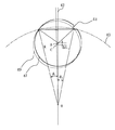 先ず始めに、本発明の原理を説明する。図4は、円盤の円周と1個のセンサの円弧状の軌跡とが交差する場合を示す。測定すべき円盤47は、既知半径rの上記円周とセンサの既知半径Rの円弧状の検出軌跡43との交点をW1 ,W2 、それらの交点間の上記円周の円弧の頂点をW3 とすると、円弧W1 W3 W2 を形成する。この円弧の両端が為す線分W1 W2 の垂直二等分線42は、測定円盤47の中心Aおよびセンサの円弧軌跡の中心Oの双方を通る。この垂直二等分線42と、予め教示した方向41との偏移角度αは、測定により求めることができる。また、垂直二等分線42と円弧の一端W1 との為す角度θも測定により求めることができる。