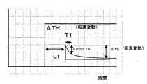 図5、図6、図7にあるように板厚変動、ガス流量変動、速度変動に対する鋼板温度の応答性はそれぞれ、むだ時間L1、L2、L3、立ち上がり時間T1、T2、T3となり、それぞれ通板速度などにより変動する。この応答性の遅い制御端の応答時間及び既存制御出力に合わせて応答性の早い設備の出力の変動させる制御出力を決定することはもちろんである。