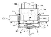 また、キャップ1の底部7は、中央が下向きに突出するような緩やかなテーパー状に形成されており、その中央には、平面視円形の油抜き穴9が本形態では一箇所貫通して設けられている。一方、キャップ1の外側壁面をなす円筒部11の下寄り部位には、円形をなす1つの空気流入穴13が貫通して設けられている。なお、本形態では、その油抜き穴9の径は4mmとされ、空気流入穴13の径は3mmとされている。また、この空気流入穴13の設けられている筒状部11の下寄り部位の内径は、本形態では段部14を介してやや小さく設定されている。