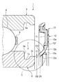そして、図2(C)に示されるように、接触型シール10の装着完了時には、内径側周端部12dの最小内径D1は肩部7cの外径D2よりも小さく若しくは等しくなり、内径側周端部12dは、シール溝7内部に進入して肩部7cと軸方向に重畳(オーバーラップ)する。