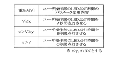 この点灯制御プログラムでは、同図2に示すように、電池電圧に基づいて電圧レベルが3つに分けられ、それぞれの電圧に応じて、LED17を点灯するための点灯制御パラメータが変更されるようになっている。すなわち、電池電圧V≧xのとき、LED17の点灯時間がA秒、電池電圧Vがx>V≧yのとき、LED17の点灯時間がB秒、及び、電池電圧Vがy>Vのとき、LED17の点灯時間がC秒に設定される。ただし、x>y、A>B>Cである。