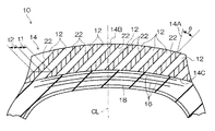 以下、本発明の実施の形態を図面に基づき説明する。本実施の形態に係る空気入りタイヤ10は、図1において、第1ゴム層12及び該第1ゴム層12より弾性率の小さい第2ゴム層22がトレッド踏面14Bの法線14Aに対して夫々傾斜しかつ互い違いにタイヤ幅方向に重なって配置されてなるトレッド14を有しており、トレッド14のタイヤ中心側には、ベルト層16、カーカス18が配置されている。