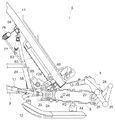 図1,2,4に示すように、丸パイプ状の支持フレーム55が支持フレーム18,52に溶接により固定されて右及び左側方に延出されており、L字状に折り曲げられた保護フレーム56が支持フレーム55に取り付けられている。保護フレーム56が支持レール46の右及び左端部の外側に位置しており、保護フレーム56により支持レール46の右及び左端部が保護されている。