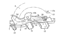 左右のホイルハウス8の前端部よりもやや前側において、左右のサイドフレーム7間に橋渡し状に架設されてフロアパネル6に接合されるクロスメンバ10が設けられている。 また、左右のホイルハウス8間において左右のサイドフレーム7間に橋渡し状に架設されてフロアパネル6に接合されるクロスメンバ11,12が設けられ、補強ガセット9の内端部の一部がクロスメンバ11,12の上端部のフランジに接合される(図6参照)。