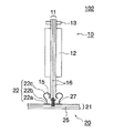 図3に、図1のIII−III方向に沿って見た断面を示す。各コンタクト端子22は、基板本体21上に固定された平面状の基部22aと、基部22aから基部22aに対して垂直に突出する支持部22bと、支持部22b上に支持されたコンタクト部22cとを備える。コンタクト部22cは、支持部22bの先端を略円形に折り曲げた形状を有し、支持部22bの弾性力によってメモリ・モジュール基板10のパッド端子に押し付けられる。これによって、コンタクト端子22とメモリ・モジュール基板10のパッド端子とが電気的に接続されると共に、メモリ・モジュール基板10がマザーボード20に対して固定される。