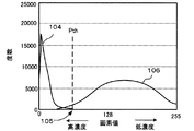 閾値計算部36は、改善画像データ42の画像特徴、とりわけ濃度分布の特徴に基づいて動的に、背景画像と目的画像を峻別するための2値化閾値44が決定される。すなわち、閾値計算部36は、改善画像データ42の全領域の濃度分布のヒストグラムを作成し、そのヒストグラムに基づいて、背景画像と目的画像を峻別するための2値化閾値44を計算する。既に、濃度分布改善部32によって、改善画像データ42の濃度分布が、背景画像と目的画像ができるだけ別の濃度範囲に分離するように改善されているので、閾値計算部36では、背景画像と目的画像をより良好に峻別できるような2値化閾値44を決定することができる。この2値化閾値44は、2値化部34に入力される。