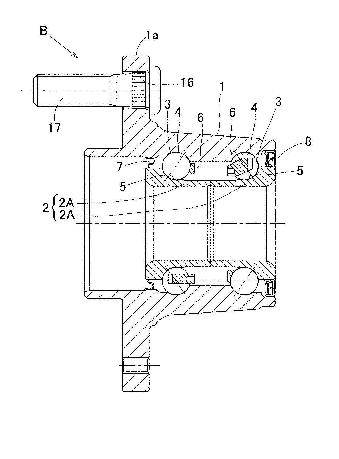 外方部材1は固定側の部材となるものであって、車体取付フランジ1bを外周に有し、その車体取付フランジ1aが車体に設置されたナックルにボルト(いずれも図示せず)で締結される。