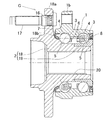 内方部材2は回転側の部材となるものであって、アウトボード側端に車輪取付用のフランジ18aを有するハブ輪18と、このハブ輪18の中央孔20に挿入されて嵌合する等速ジョイント23の外輪24とでなり、前記複列の転走面5におけるアウトボード側列の転走面5がハブ輪18に、インボード側列の転走面5が等速ジョイント外輪24にそれぞれ形成されている。ハブ輪18のフランジ18aには、そのボルト挿通孔16を貫通するハブボルト17、およびこのハブボルト17に螺合するハブナット(図示せず)により、ディスクブレーキ装置のブレーキロータと車輪(いずれも図示せず)とが重ねて取付けられる。図9における左端の密封装置7は、図7の実施形態における図8の構造のものとされる。右端の密封装置8は、第1の実施形態における図3の構造のものとされる。密封装置7,8における弾性体13,22の素材条件も第1の実施形態の場合と同じであり、第1の実施形態の場合と同様の作用効果が得られる。