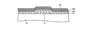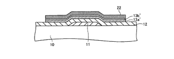 つぎに、図4−5に示すようにレジスト22を塗布し、図4−6に示すようにパターニングする。そして、パターニングしたレジスト22をマスクに用いて第2チャネル層13b用のドープアモルファスシリコン膜(ドープ半導体膜)13b′および第1チャネル層13a用のアモルファスシリコン膜(真性半導体膜)13a′のエッチングを行って図4−7に示すように第1チャネル層(真性半導体層)13aと第2チャネル層(ドープ半導体層)13bとを形成し、レジスト22を除去する。図4−8にレジスト除去後の状態を示す。