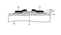 本実施の形態にかかる薄膜トランジスタは、図1および図2に示すように基板10と、該基板上に形成されたゲート層11と、基板10およびゲート層11上に一様に形成されたゲート絶縁膜12と、絶縁膜12上におけるゲート層11上およびその周囲の領域に形成されたチャネル層13と、チャネル層13上に形成されたソース・ドレイン層14とを備えて構成されている。
