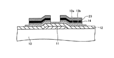 つぎに、図4−9に示すようにソース・ドレイン層14用の金属層14′を堆積し、レジスト23を塗布し、図4−10に示すようにレジスト23をパターニングする。この金属層は、たとえばスパッタリング法などによって形成することができ、アルミニウム、チタン、珪化モリブデン、ITO等を単層または多層に堆積して形成することができる。そして、パターニングしたレジスト23をマスクに用いて図4−11に示すように金属層14′のエッチングを行ってソース・ドレイン層14を形成する。このとき、図1に示すようにソース・ドレイン層14の端部P1、P2、P3、P4を曲線形状に形成する。さらに図4−12に示すように第2チャネル層(ドープ半導体層)13bのエッチングを行ってパターニングをし、レジスト23を除去する。図4−13にレジスト除去後の状態を示す。以上により、図1および図2に示した本実施の形態にかかる薄膜トランジスタが完成する。