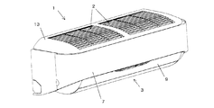 吹出口3には、空気の流れの向きを上下方向に変えるルーバー9が揺動自在に取り付けられている。なお、このルーバ9は冷暖房気流の送風をOFFしたときには速やかに稼働し、図示のごとく、吹出口3を閉じた状態にする。すなわちルーバ9は、吹出口3の開閉パネルの役割も有する。