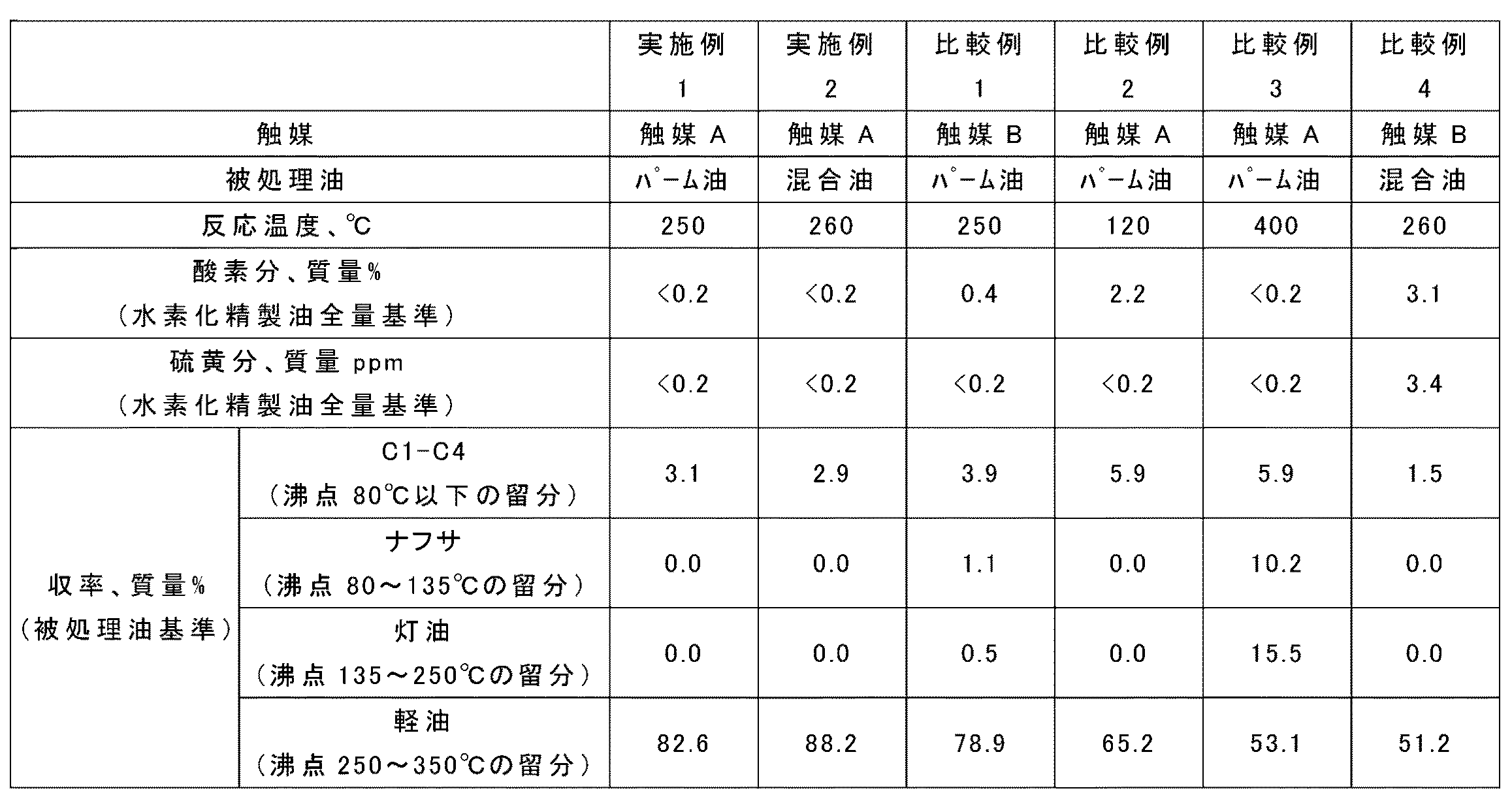 実施例1で使用したものと同一のパーム油70体積部と石油系脱硫軽油30体積部とを混合した混合油を被処理油として用い、第一及び第二反応管の反応温度を260℃としたこと以外は、実施例1と同様にして水素化精製を行った。石油系脱硫軽油の15℃密度は0.838g/ml、硫黄分の含有量は15質量ppm、初留点及び終点は、それぞれ211℃及び365℃である。被処理油の密度は0.893g/ml、酸素分の含有量は8.2質量%、硫黄分の含有量は4.2質量ppmである。