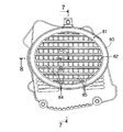 - 請求項2記載のルーバーを有するカバーを成形するためのカバー成形用金型装置であって、前記フィン主部(84a)の外側面および外端面ならびに前記張出部(84b)の外面および先端面を形成する第1成形部(91a)を有する第1金型(91)と、前記フィン主部(84a)の内側面および内端面ならびに前記張出部(84b)の内面を形成する第2成形部(92a)を有する第2金型(92)とを備えることを特徴とするカバー成形用金型装置。