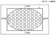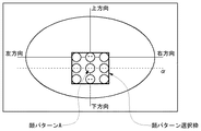図9は、方向別顔検出パターンを説明する図である。顔向きには、上方向、下方向、右方向、左方向の4方向の向きが存在するため、それぞれの向きに対応した顔検出パターンをマトリクス状に配置してあらかじめ用意しておく。図9における各々の丸い絵が、それぞれの顔向きに対応した顔検出パターンを表している。また、図9の例では、上下方向に最大7つ、左右方向に最大9つの顔検出パターンを配置しているが、この配置間隔はこれよりも多くても少なくても構わない。