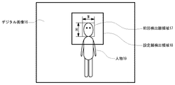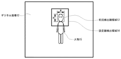 顔検出領域設定部2は、映像入力部1で出力されたデジタル画像10から人物11の顔領域の検出を行うための処理領域である検出領域の設定を行う。本装置の起動時、および直前の一定時間内に人物の顔を検出していない場合は、顔検出領域設定部2は、デジタル画像10の全領域を顔検出の検出領域に設定する。これは、人物が画面内に登場する前であるので、画面内の任意の位置に人物が登場しても対応できるようにするためである。直前の一定時間内に人物の顔を検出した場合は、顔検出領域設定部2は、直前に検出した顔のサイズと向きの情報から顔検出の検出領域を決定する。