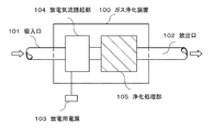 一方、前記浄化処理部105には、例えば活性炭、両性界面活性剤系消臭剤、緑茶抽出物、多孔質シリコーン樹脂などの不純物の吸着材や、粒状酸化チタンなどの光触媒やオゾン発生装置などの不純物分解装置を使用することができる。特に、本実施形態においては、前記第1と第2の電極間の放電により発生したオゾンが浄化装置外部に漏出することを防止するためのオゾン分解触媒を、不純物の浄化処理手段として使用する。
