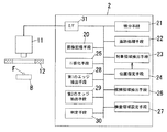 TVカメラ11で得られた濃淡画像(明度値を画素値とするデジタル画像)は、画像処理装置2に入力される。画像処理装置2は、画像を取り込むためのインターフェース31および画像記憶用の画像記憶手段20を備え、TVカメラ11からの濃淡画像は画像記憶手段20に一旦格納される。画像記憶手段20は後述する処理で生成される各画像の記憶にも用いられる。画像処理装置2は、コンピュータを主構成とする装置であり、適宜のプログラムを実行することにより、以下の処理を可能にする。