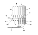 そして、振動板部材2の外面側(液室と反対面側)に各加圧液室6に対応して加圧液室6内のインクを加圧するための圧力発生手段(アクチュエータ手段)である電気機械変換素子としての積層型圧電素子12を接合し、この圧電素子12を金属あるいはセラミックスなどの高剛性材料で形成したベース基板13に接合している。積層型圧電素子12は積層型圧電素子部材をダイシングにより溝加工されており、1つ毎に圧電素子は各圧力室6と圧力室6の間とに対応するように分離されている構造となっている。ここで、圧力室6の間に対応する圧電素子は駆動せずに構造上、支柱として機能している。