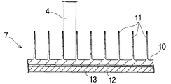 ・図10に示す変形例4は、2本一組の針状体(11)の基部を互いに連結してV字状に形成し、各針状体(11)を面状基材(10)に対し傾斜させたものである。即ち、各針状体(11)の基部は連結部(14)を構成し、面状基材(10)に織り込まれている。